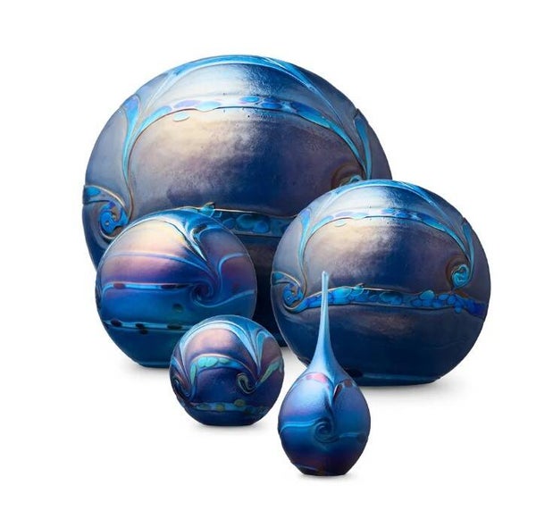 De Elan-line is geïnspireerd op de 4 elementen uit de natuur: aarde, water, lucht en vuur. De Elan-line vertegenwoordigd een collectie as-gedenkornamenten met voornamelijk ronde vormen en zijn verkrijgbaar in diverse kleurcombinaties. De Elan-line is een unieke collectie urnen die met bezieling is vervaardigd. Uniek in onze collectie is deze 4 liter urn. De bolvormige urn heeft een kleurencombinatie van blauwtinten met een zachte parelmoerglans en is afgewerkt met een fijn reliëf. Aan de binnenzijde van de urn bevindt zich een as-reservoir waar al het crematie-as in bewaard kan worden. Deze urn wordt afgesloten d.m.v. een zelf-hechtende sluitplaat. De urn is niet transparant dus het crematie-as is niet zichtbaar. Deze prachtige urn is meer dan een as-gedenkornament, het is een waar kunstwerk dat tevens zeer geschikt is als grafornament. Dit maakt elk ornament uniek.