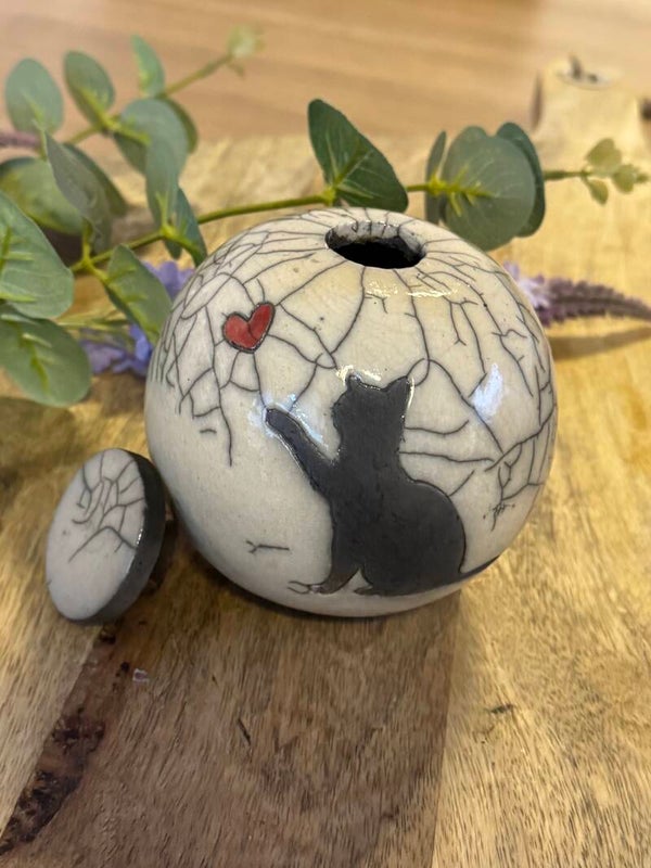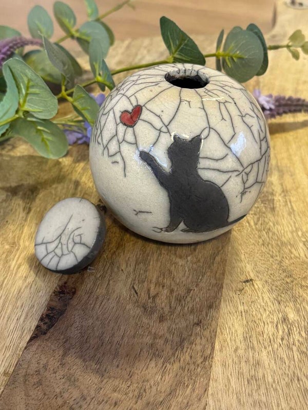 Een urn met liefde gemaakt voor uw dierbare maatje...Gemaakt uit klei door de raku- techniek.Alle urnen zijn uniek. Productcode:UA001Inhoud: 225 ml
