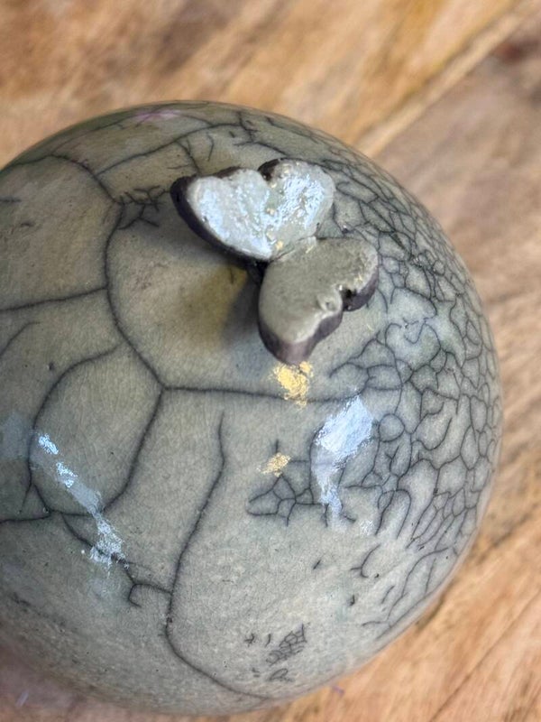 Mooie kleine bol urn met vlinderEen urn met liefde gemaakt voor uw dierbare maatje...Gemaakt uit klei door de raku- techniek door het urnenatelier.Alle urnen zijn uniek.Doorsnee = 8 cm Inhoud: 100mlProductcode: UA026