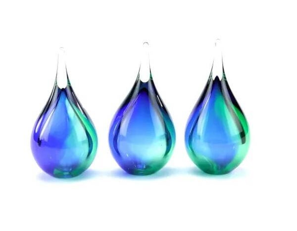 Druppel small: "kleine druppel" De as-druppel small Blauw/groen heeft de vorm van een kleine sierlijke druppel. In de kern van de as-druppel bevindt zich een klein as(poeder)-reservoir waar een gedeelte van het resomeer-poeder in bewaard kan worden. Het poeder-reservoir wordt afgesloten d.m.v. een zelf-hechtend sluitplaatje. Door de transparantie van het kristalglas is het resomeer-poeder goed zichtbaar. In combinatie met de warme kleurschakeringen krijgt het as(poeder)-gedenkornament een extra dimensie en prachtige uitstraling. De as-druppel small is een lieflijk aandenken ter herinnering aan uw dierbare. Alle as-gedenkornamenten zijn van kristalglas en met de hand vervaardigd. Dit maakt elk ornament uniek.