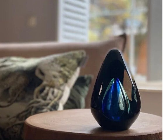 Diamond black blue: "een zwarte diamant met een krachtige blauwe kern" Dit prachtige as-gedenkornament is geïnspireerd op een zwarte diamant. De buitenzijde heeft een mooie afwerking van zwart glanzend- en transparant geslepen kristalglas met in de kern blauwe kleurschakeringen. In de kern bevindt zich een as-resevoir waar een gedeelte van het crematie-as in bewaard kan worden. Door de transparantie van het as-gedenkornament is het crematie-as deels zichtbaar. In combinatie met de kleurschakeringen krijgt het as-gedenkornament een extra dimensie en prachtige uitstraling. D.m.v. een zelf-hechtende sluitplaat wordt het as-reservoir afgesloten. Dit as-gedenkornament valt onder de Premium A-lijn en wordt gekenmerkt door haar fijne afwerking. De "diamant zwart/blauw" is een waar sieraad ter herinnering aan uw dierbare. Alle as-gedenkornamenten zijn van kristalglas en worden met de hand vervaardigd. Dit maakt elk ornament uniek.